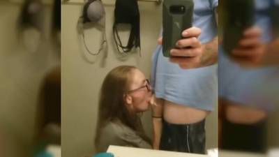 Chaude amatrice à genoux dans la salle de bain pour sucer son mec