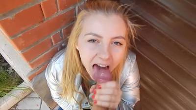 Blonde à genoux contre le mur et volet de la maison s'occupe de pomper jusqu'au bout la queue de son compagnon.
