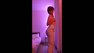 C'est l'heure d'aller se coucher ! Mais avant d'aller au lit, notre jeune étudiante nous offre une exhibition. Topless dans son bas de pyjama, elle se dandine sensuellement et caresse sa poitrine menue. Elle est mince, sexy et je pense maintenant bien trop excitée pour pourvoir s'endormir tout de suite. Va-t-elle se caresser ?