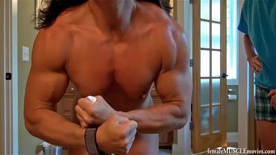 Dopée au stéroïde au début de cette vidéo grâce à une piqûre dans le cul que lui offre son mec, cette amatrice body-buildée exhibe ensuite ses muscles près de la caméra. Elle n'a que très peu des seins mais énormément de muscles et quand, elle en a fini avec cet étalage, elle suce son homme. Visiblement il aime les femmes qui travaillent leur corps et ce léchage de queue lui convient. Pendant qu'elle coince sa queue entre ses lèvres et qu'elle la branle on voit bien ses biceps !