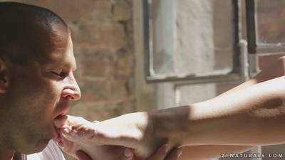 Un fétichiste embrasse les pieds d'une jeune blonde. Il lui mange la moule. La coquine lui fait une branlette avec ses pieds avant qu'il la saute.